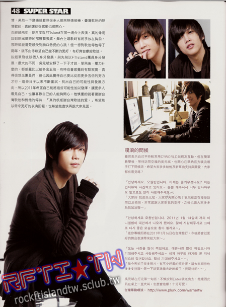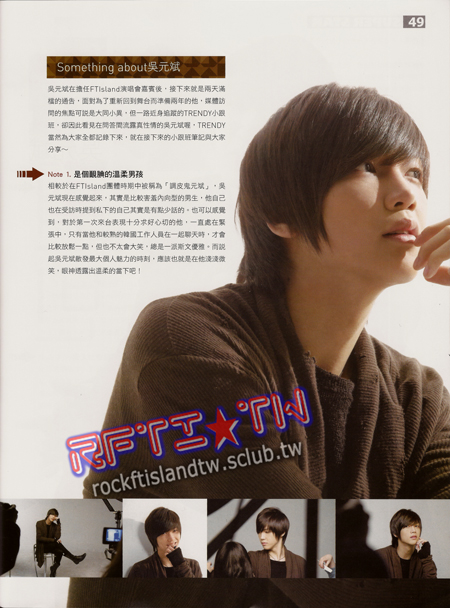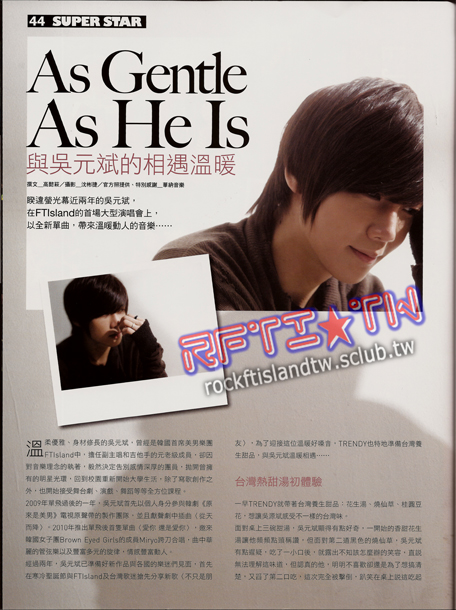 元斌:我是個滿内向、安静的人、通常都沒什麼、喜歡自己一個人獨處。(但你又有ROCKER爆發的靈魂?這是不是很兩極?)我也有這樣覺得、尤其我看到李洪基在舞台上飆吉他的感覺、我看著看著也熱血起來、我以後在台上也要彈吉也!哈!